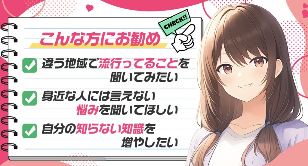 「最近、誰かと本音で喋ってないな」と思ったら、まずは一度インストールしてみて。新しい出会いが、あなたの毎日に素敵な彩りを添えてくれるはずだよ!