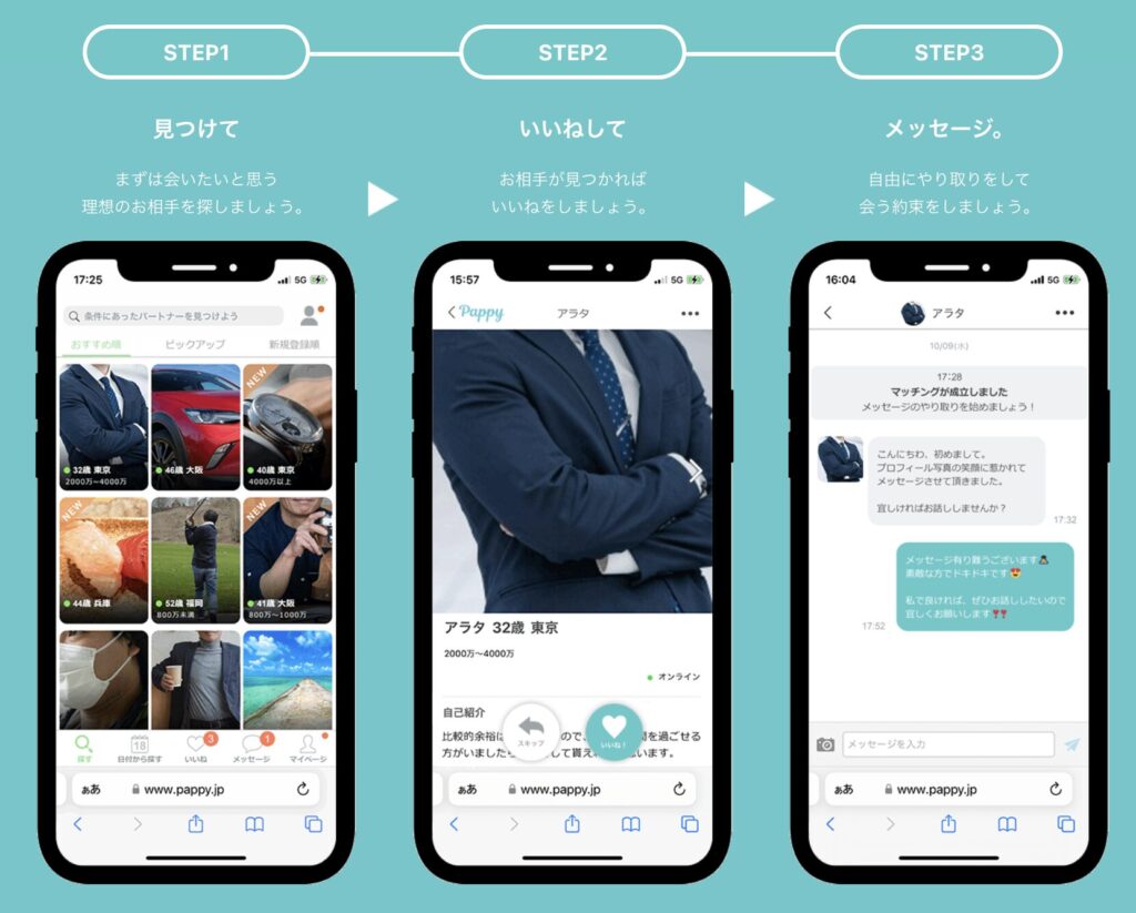 「ペイターズとかシュガーダディも使ってたけど、ライバルが強すぎて疲れてた。試しにPappyを使ってみたら、意外と可愛い子から返信が来るし、スムーズに会えた。」(40代男性)