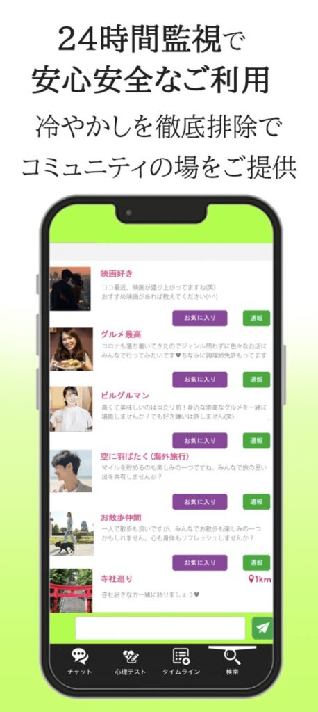 また、運営は国内企業が行っており、24時間365日の監視体制を敷いています。不適切な投稿や怪しい勧誘を行うユーザー(業者やサクラなど)は、システム検知と有人監視のダブルチェックで排除される仕組みになっています。